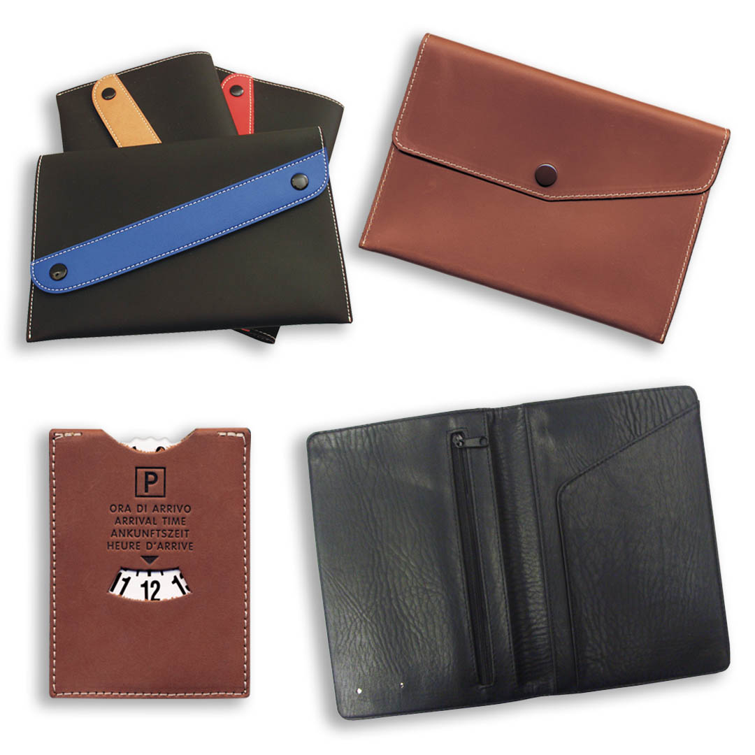 Portadocumenti, porta sim, dischi orari in pelle, eco pelle e sky: tutti con forme e modelli standard o completamente personalizzabili.